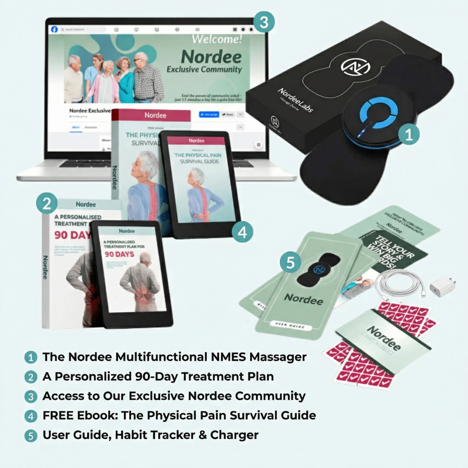 - The Nordee Multifunctional NMES Massager – Including storage box and self-adhesive pads.