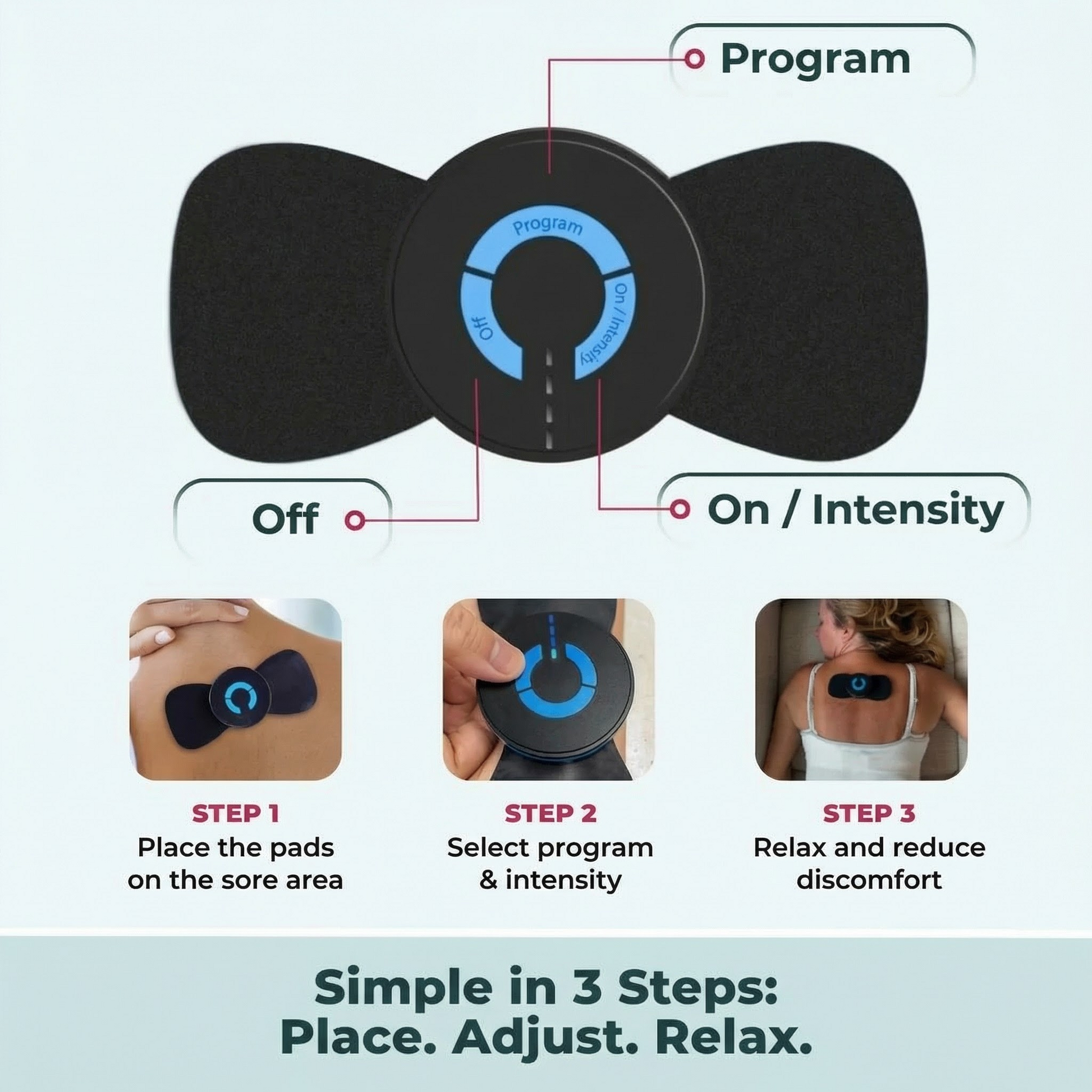 Attach the self-adhesive gel pad, choose a massage program, and let the device do the work.